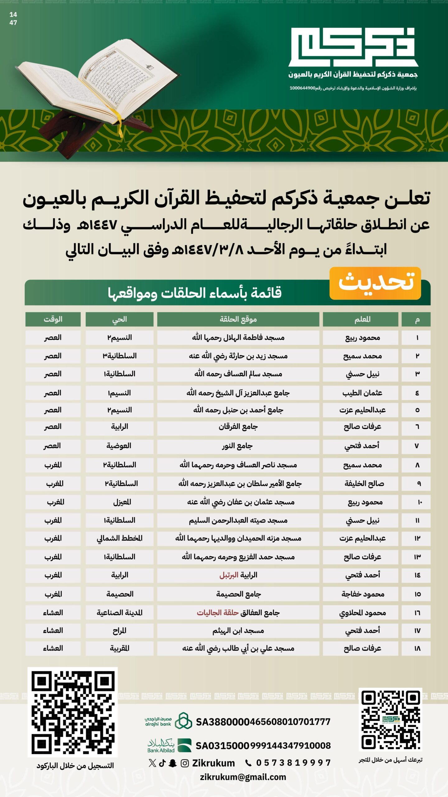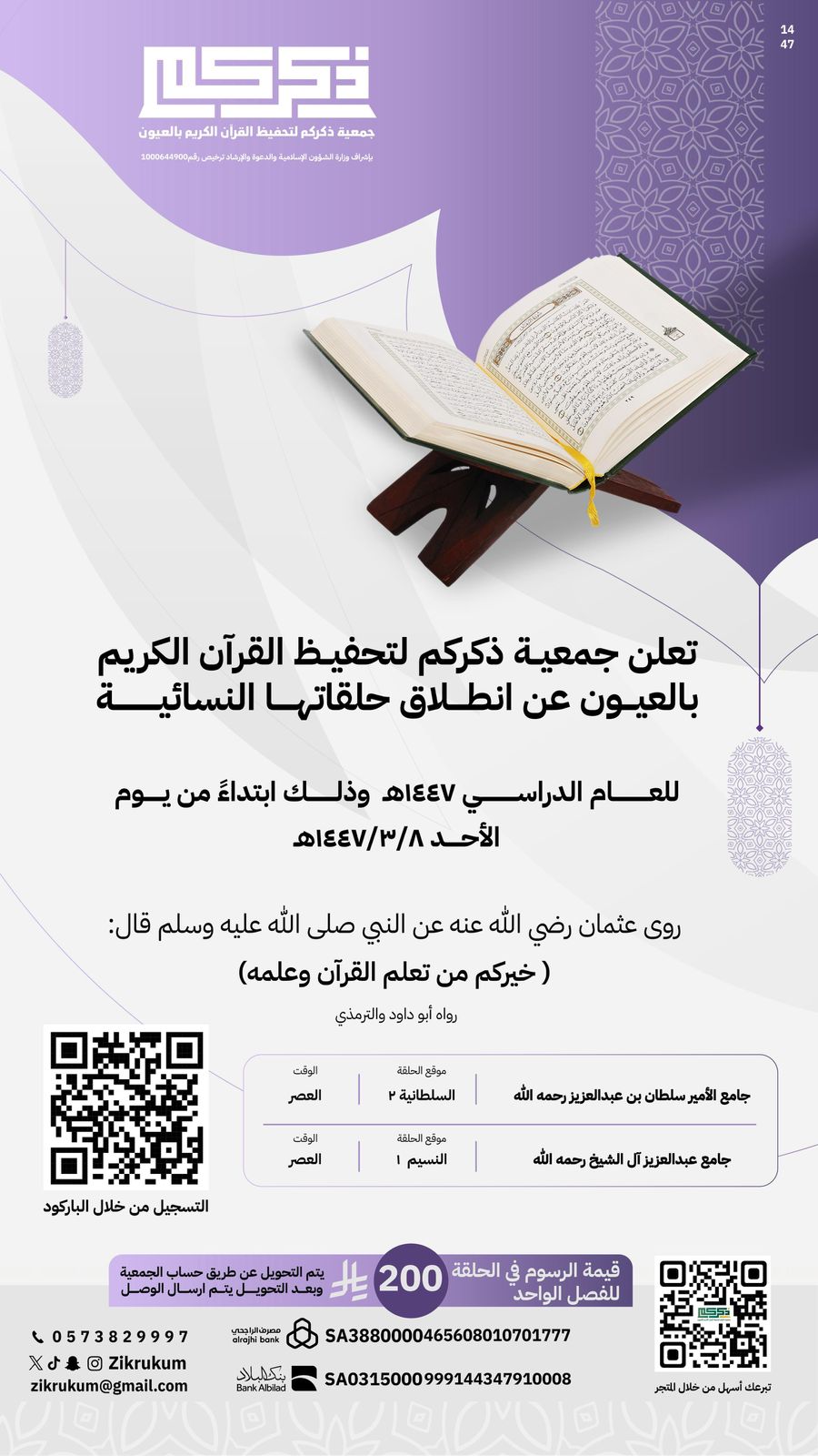 ▪︎ تُعلن جمعية ذكركم لتحفيظ القرآن الكريم بالعيون عن انطلاق الحلقات القرآنية بالجوامع و المساجد للرجال والنساء ، على أن تكون بداية التسجيل من اليوم الخميس 1447/2/20هـ الموافق 2025/8/14 على أن تكون بداية الحلقات من يوم الأحد